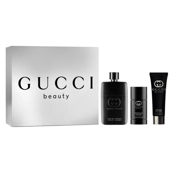 Zestaw zapachowy Guilty Pour Homme, w skład którego wchodzi woda perfumowana 90ml, żel pod prysznic 50ml oraz dezodorant w sztyfcie 75ml.