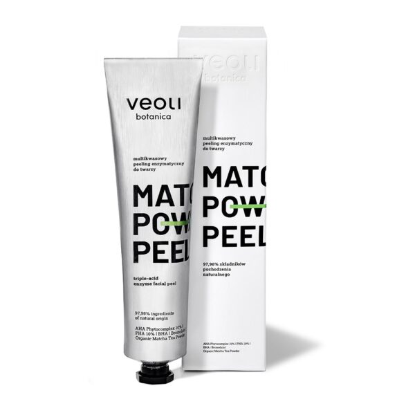 Multikwasowy peeling enzymatyczny z aktywnym kompleksem AHA Phytocomplex 10%, PHA 10%, BHA oraz ze sproszkowaną, organiczną zieloną herbatą matcha w formie ekspresowej maski. AHA Phytocomplex 10% – kompozycja naturalnych kwasów owocowych (cytrynowy, mlekowy, winowy) oraz bromelaina – enzym pozyskiwany z ananasa, natychmiastowo złuszczają, wygładzają i rewitalizują skórę twarzy oraz skutecznie usuwają martwe komórki naskórka, wyrównując koloryt i zmniejszając widoczność porów. Dzięki zawartości BHA kwasu salicylowego peeling reguluje wydzielanie sebum, działa matująco, a także zmniejsza zaczerwienienia skóry towarzyszące niedoskonałościom. PHA (glukonolakton) skutecznie redukuje przebarwienia, pozostawia skórę ukojoną i jedwabiście gładką. Matcha pochodząca z organicznych upraw herbacianych w Japonii oraz roślinny retinol (bakuchiol) działają detoksykująco, stanowiąc silną ochronę antyoksydacyjną, regenerują skórę, przywracając jej jędrność i promienny wygląd. Peeling idealnie nadaje się skóry pozbawionej blasku, z widocznymi nierównościami i przebarwieniami, w tym do wrażliwej.