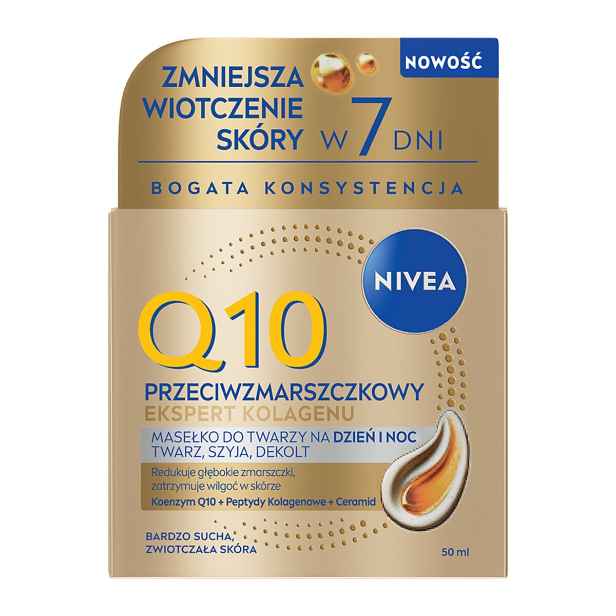 Zapewnij swojej cerze luksusowe odżywienie dzięki NIVEA Q10 Ekspert Kolagenu, wyjątkowemu masełku do twarzy, które pełni funkcję intensywnego kremu na dzień i na noc. Ta bogata pielęgnacja przeciwzmarszczkowa została stworzona z myślą o szczególnych potrzebach skóry bardzo suchej, zwiotczałej oraz pozbawionej blasku. Unikalna, gęsta konsystencja masełka natychmiastowo wtapia się w naskórek, dostarczając mu niezbędnych składników regenerujących. Formuła zawiera czysty Koenzym Q10, który stymuluje komórki do walki ze starzeniem, oraz zaawansowane Peptydy Kolagenowe wzmacniające strukturę skóry. Dodatek cennych Ceramidów skutecznie odbudowuje barierę ochronną, zatrzymując wilgoć głęboko w tkankach przez całą dobę. Regularnie stosowany krem widocznie redukuje wiotczenie, wygładza nawet utrwalone zmarszczki i przywraca twarzy wypoczęty, jędrny wygląd. Produkt intensywnie nawilża i wspiera naturalne procesy naprawcze, dzięki czemu cera odzyskuje swoją gęstość oraz wyjątkową miękkość. To idealne rozwiązanie dla osób poszukujących wielofunkcyjnego kosmetyku, który łączy siłę serum z kojącą mocą odżywczego masełka. Każda aplikacja to krok w stronę elastycznej i zdrowo wyglądającej skóry, chronionej przed negatywnym wpływem czynników zewnętrznych.